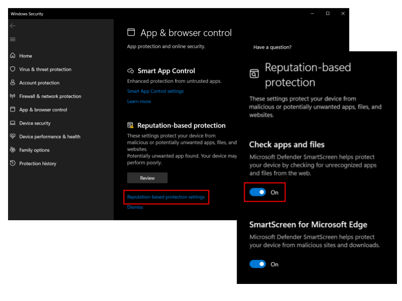 Note that in Windows 11 this feature is now called reputation-based protection. To disable it, follow these steps: