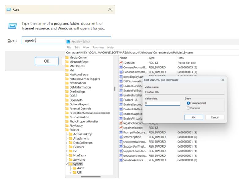- Look for the entry named EnableLUA. Double-click on it and change its value to 0.