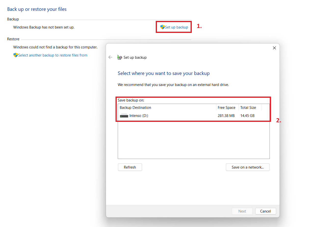 - A pop-up window will show up. Here, you can choose your preferred storage, even though Windows will suggest saving your backup to an external drive. If you prefer the network option, click on Save on a network . In this example, we’ll choose an external drive.