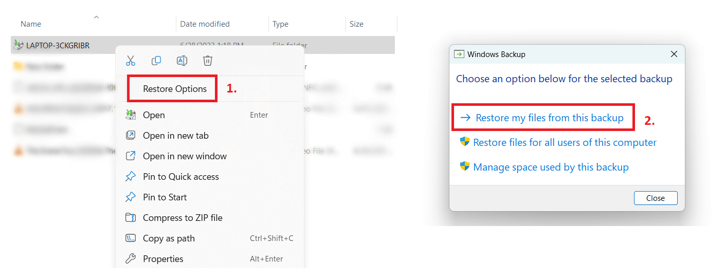 - Open the external hard drive, right-click on the backup file, and select Restore Options .