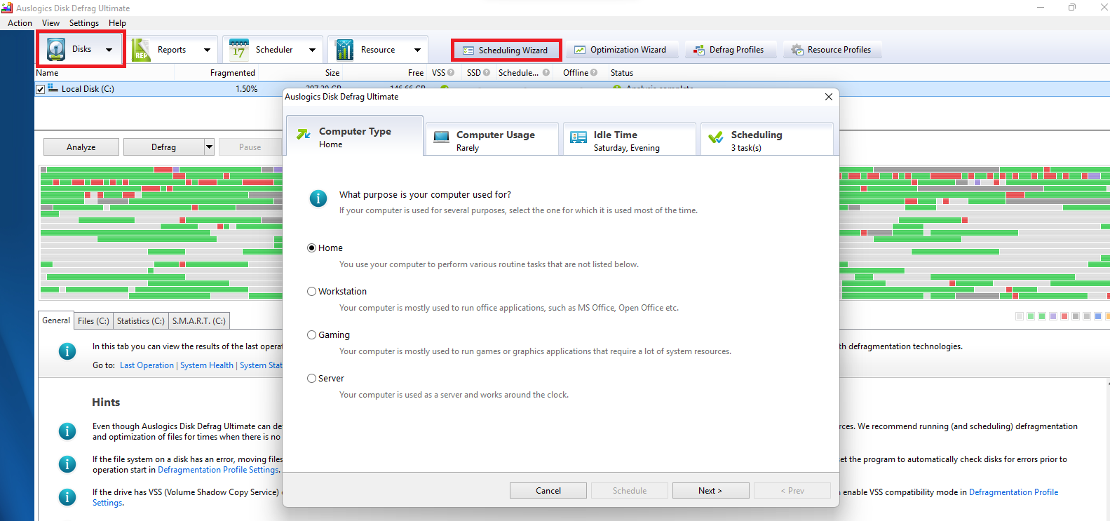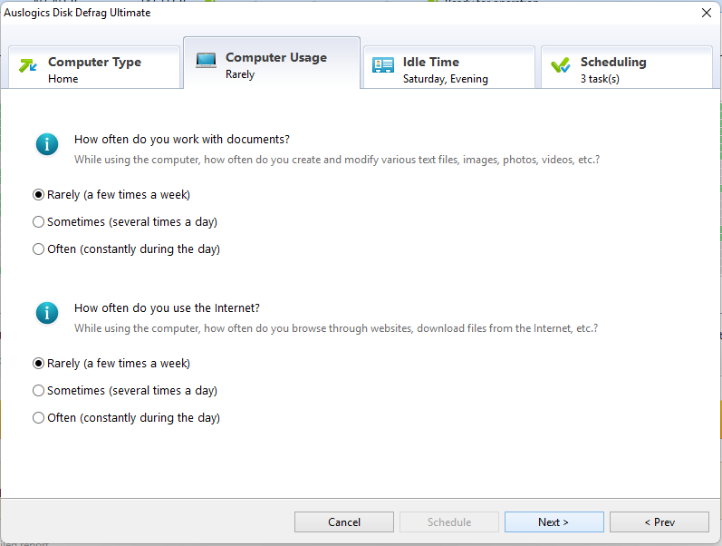 The core part of the setup process involves asking users specific questions about their PC to determine which defragmentation or optimization algorithm will be employed for best results. This also helps determine how frequently defragging should be carried out. Some of the questions include: