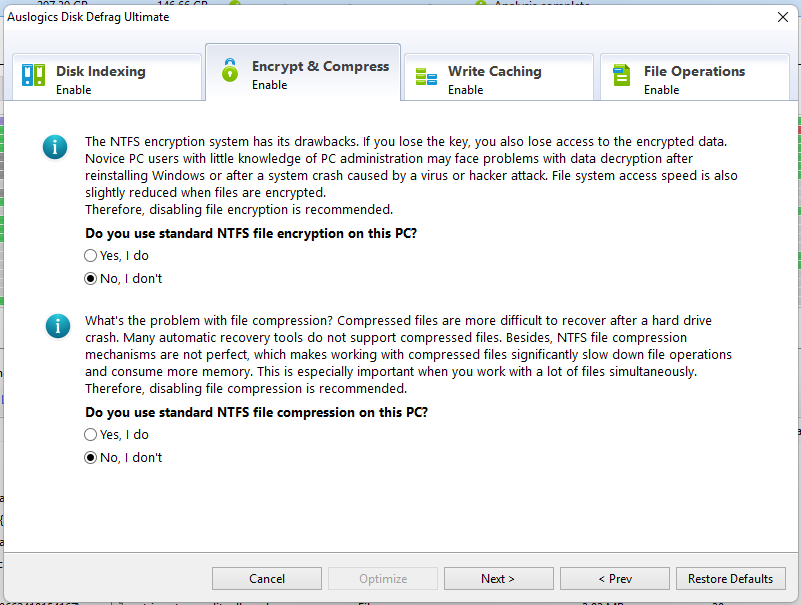 - You can choose to disable NTFS file encryption and compression to improve file system access speed and reduce memory usage.