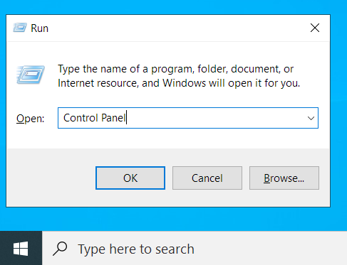 - Type ‘Control Panel’ into the text field and press Enter or click the OK button.