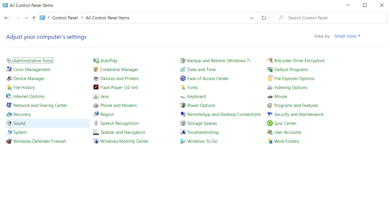 - Once you are in the Control Panel window, click on the ‘View-by:’ drop-down in the top-right corner of your screen and select ‘Small icons.’