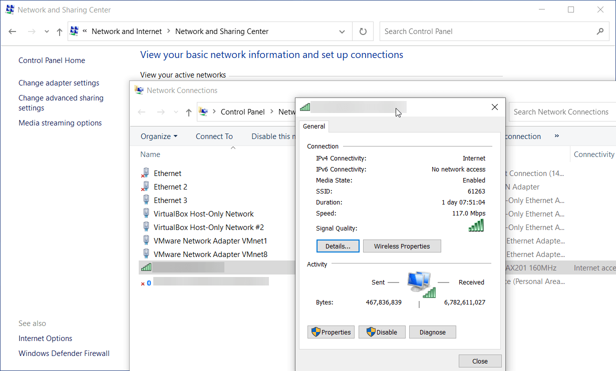 The Network and Sharing Center is literally a hub for settings related to network connections and file-sharing options on a Windows PC. It is mostly accessible from the Control Panel of the computer. Follow the steps below to check your Wi-Fi network security type using this method: