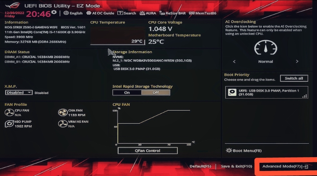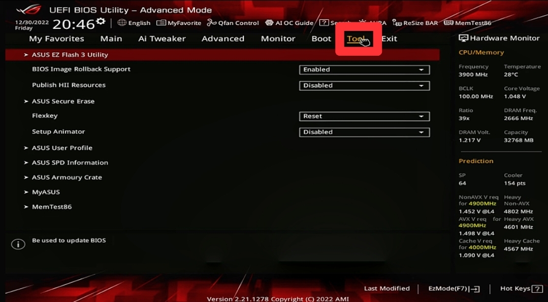 For example, on ASUS, the flash utility tool is called EZ Flash. To find it, once you’re in the BIOS environment, switch to Advanced Mode and go to Tools.