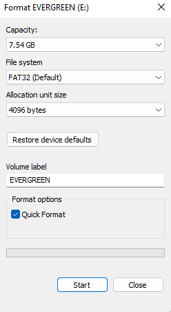 - Select FAT32 in the File system menu. Then click the Start button to format the drive.