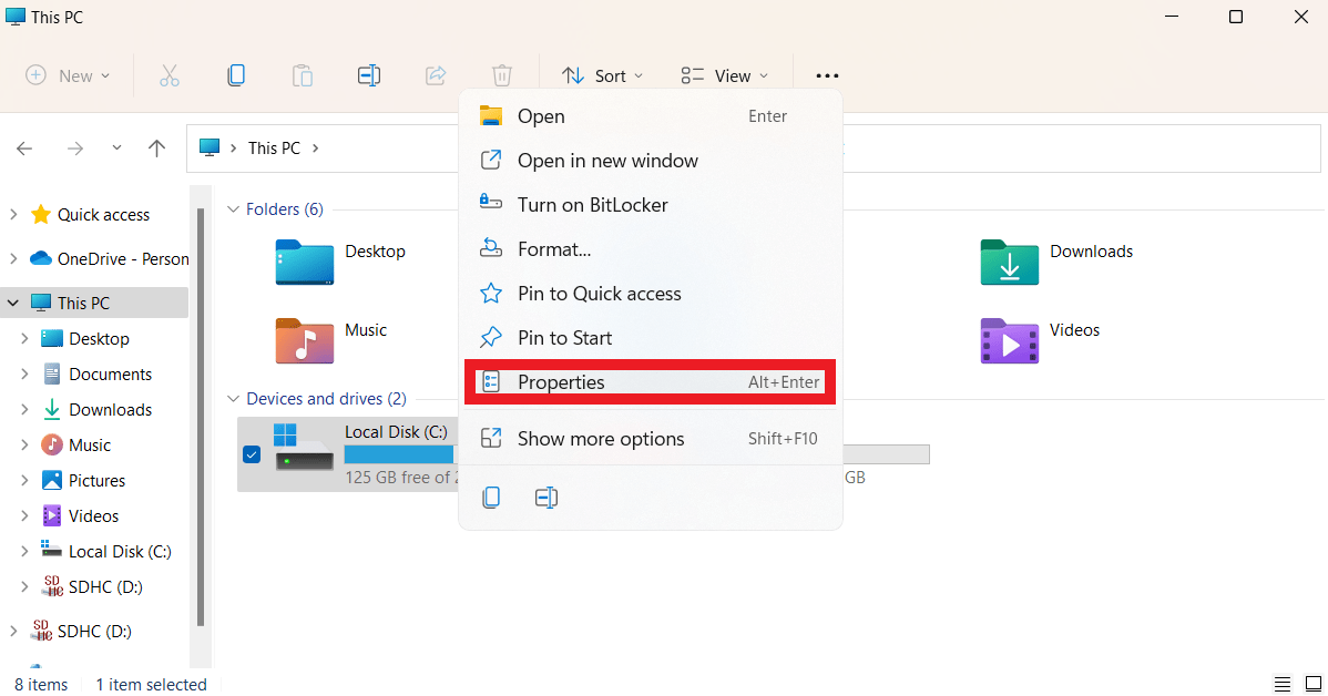 - Next, right-click the hard drive you want to fix under “Devices and drives” and select “Properties.”