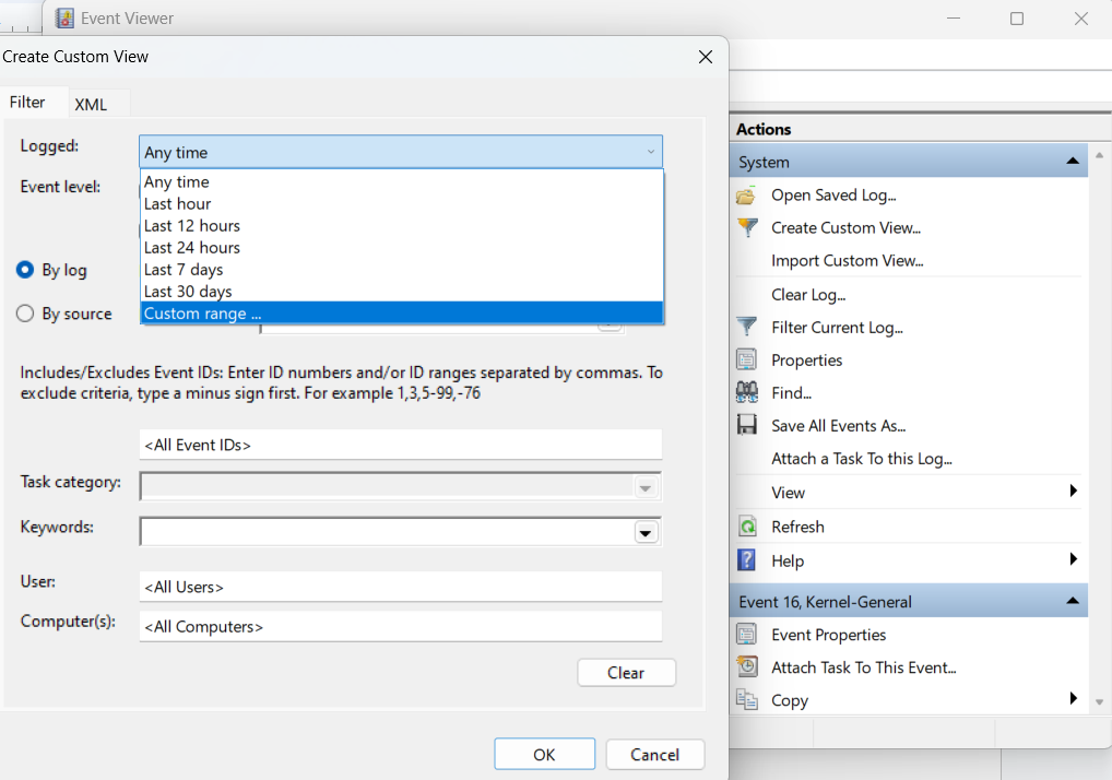 - Select the date and time range for which you want to see your Event Viewer BSOD logs.