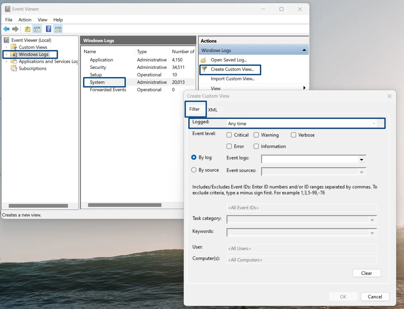 - Once the Create Custom View window appears, stay in the Filter tab.