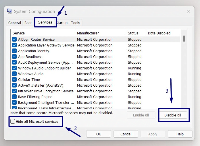 - Check the box “Hide all Microsoft services” and click “Disable all.”