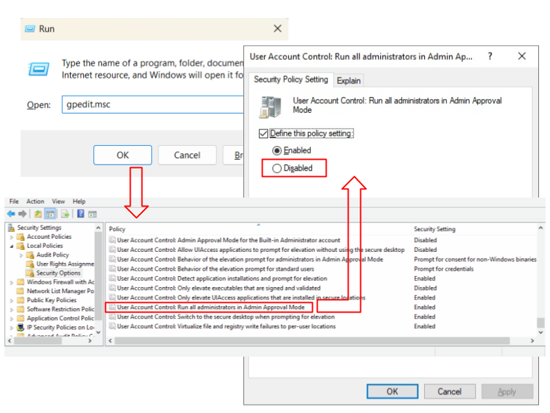 If nothing else worked, try adjusting the Group Policy settings to disable Admin Approval Mode and other UAC policies.