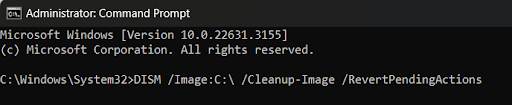 - First, input the DISM /Image:C:\ /Cleanup-Image /RevertPendingActions command (if you have Windows installed in the drive C) and tap Enter.