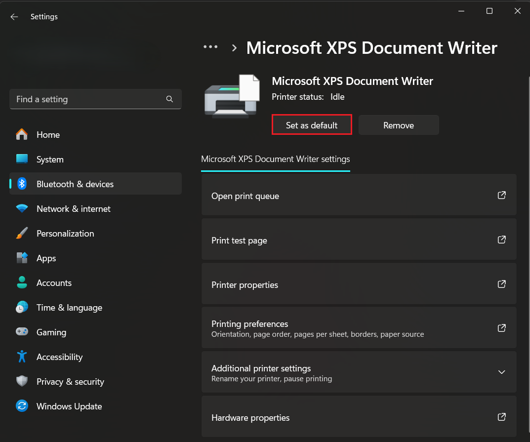 Once the printer starts working again, you can set it as your default printer. Return to Devices and Printers as shown above, right-click the printer, and select Set as default printer. For Windows 11, go to Settings > Bluetooth & devices > Printers & scanners, turn off Let Windows manage my default printer, then select your printer and click Set as default.