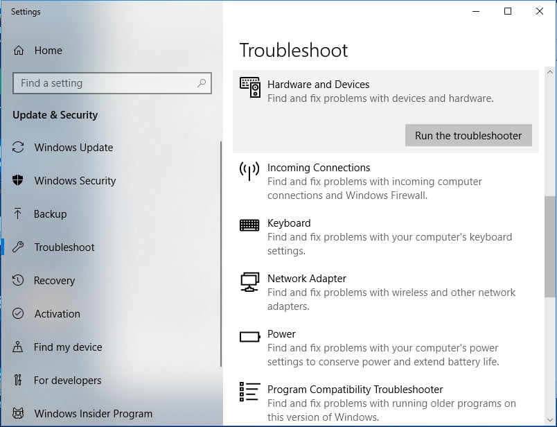 - Once the Troubleshoot window is up, scroll down until you find the entry for Hardware and Devices. Select it, then click Run the Troubleshooter.