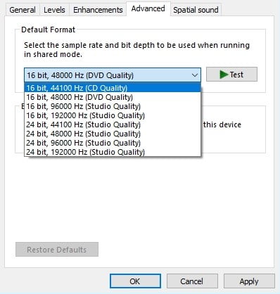 - Go to the Advanced tab, then choose any 16-bit option under the Default Format section.