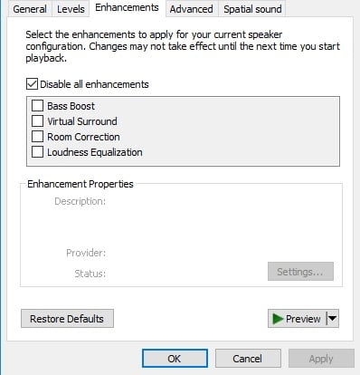 - Go to the Enhancements tab, then select the ‘Disable all enhancements’ option.