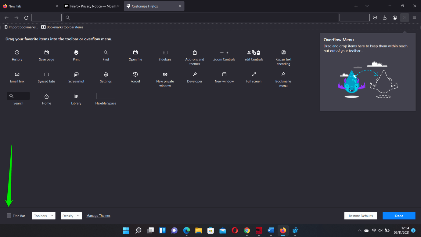 - After the Customize Firefox window shows up, head to the bottom-left corner of the screen and check the Title Bar box. You’ll notice an immediate change in the browser’s Title Bar.
