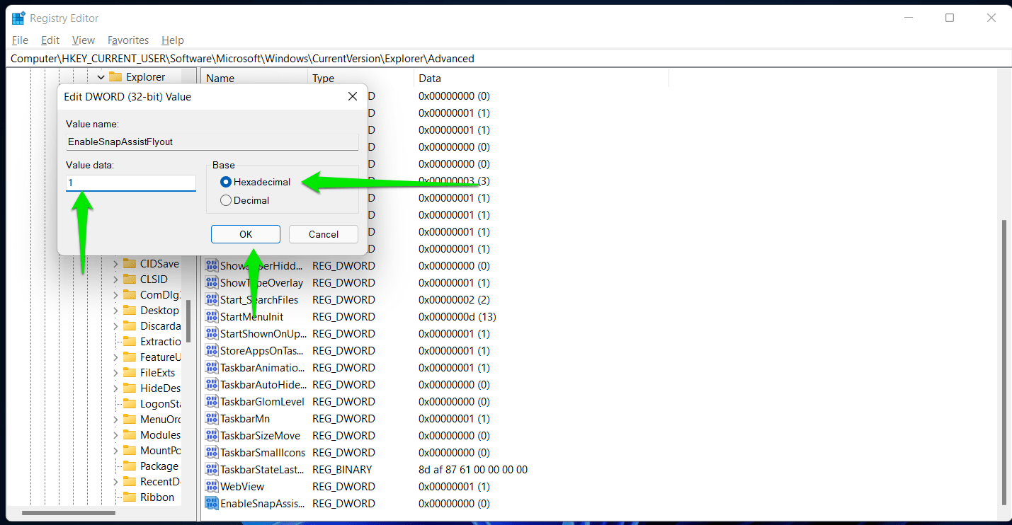 - Double-click the “EnableSnapAssistFlyout” DWORD and type “1” under Value.