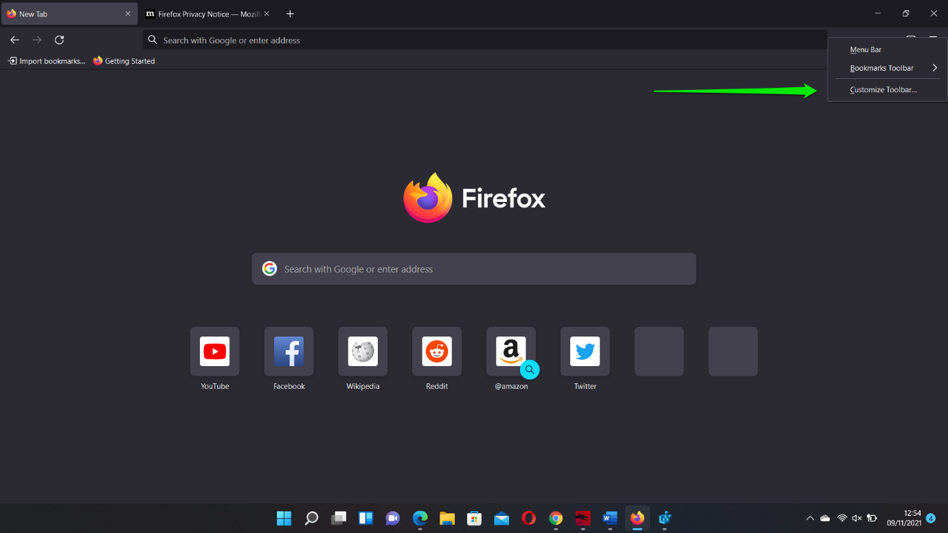 - After the browser shows up, right-click the space next to its address bar and select Customize Toolbar from the context menu.