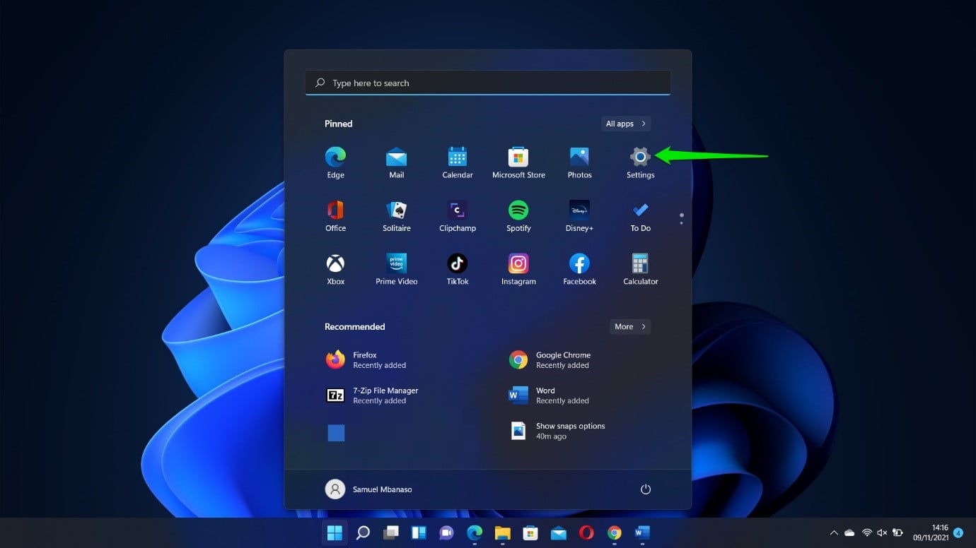 - Click on the Start button and select the Settings icon.