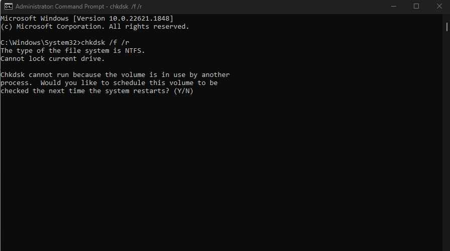 - The Check Disk scan will need to lock the selected drive. If not, you’ll be prompted to run the system check on restart. Type “Y” to select yes. On your next restart, the tool will perform the scan and resolve any issues it finds.