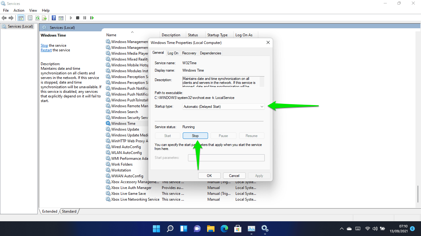 Scroll down and double-click on the Windows Time service to open its Properties dialog window when you see the Services interface.