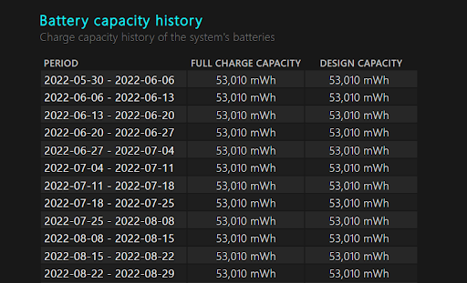 Battery capacity history displays the full charge capacity for each period compared to your battery’s design capacity. You can track your battery’s long-term health and performance by checking the full charge capacity.