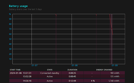 It also shows you how you were using the laptop at that specific period, whether you were consuming more power, were in low-power mode like sleeping mode, or were connected to the network during that low-power mode.