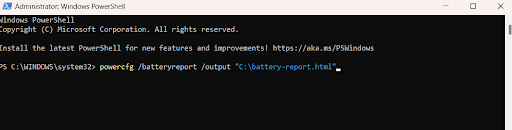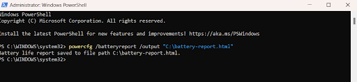 - PowerShell will generate the battery health check in an HTML file and include the location of the saved file on your computer. Close the PowerShell and check your drive C.