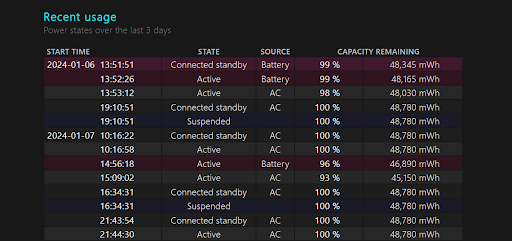 Recent usage covers the state of your laptop’s power for three days. It includes the start time, state (active or suspended), power source (battery or AC), and remaining capacity.