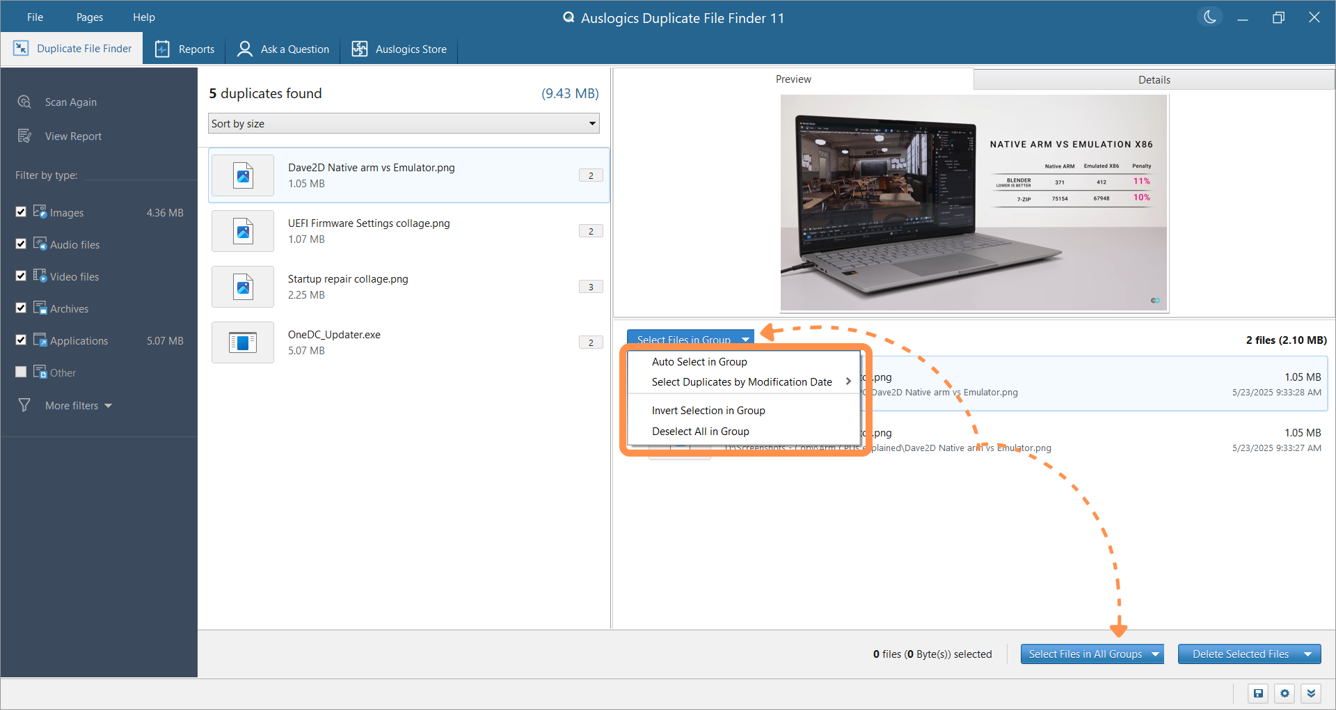- Auto-select duplicates in all groups: Regular automatic selection. Picks every duplicate in a scanning session.