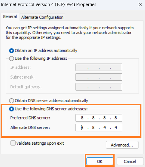 - Use Google DNS: 8.8.8.8 and 8.8.4.4