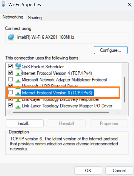 - Uncheck Internet Protocol Version 6 (TCP/IPv6).
