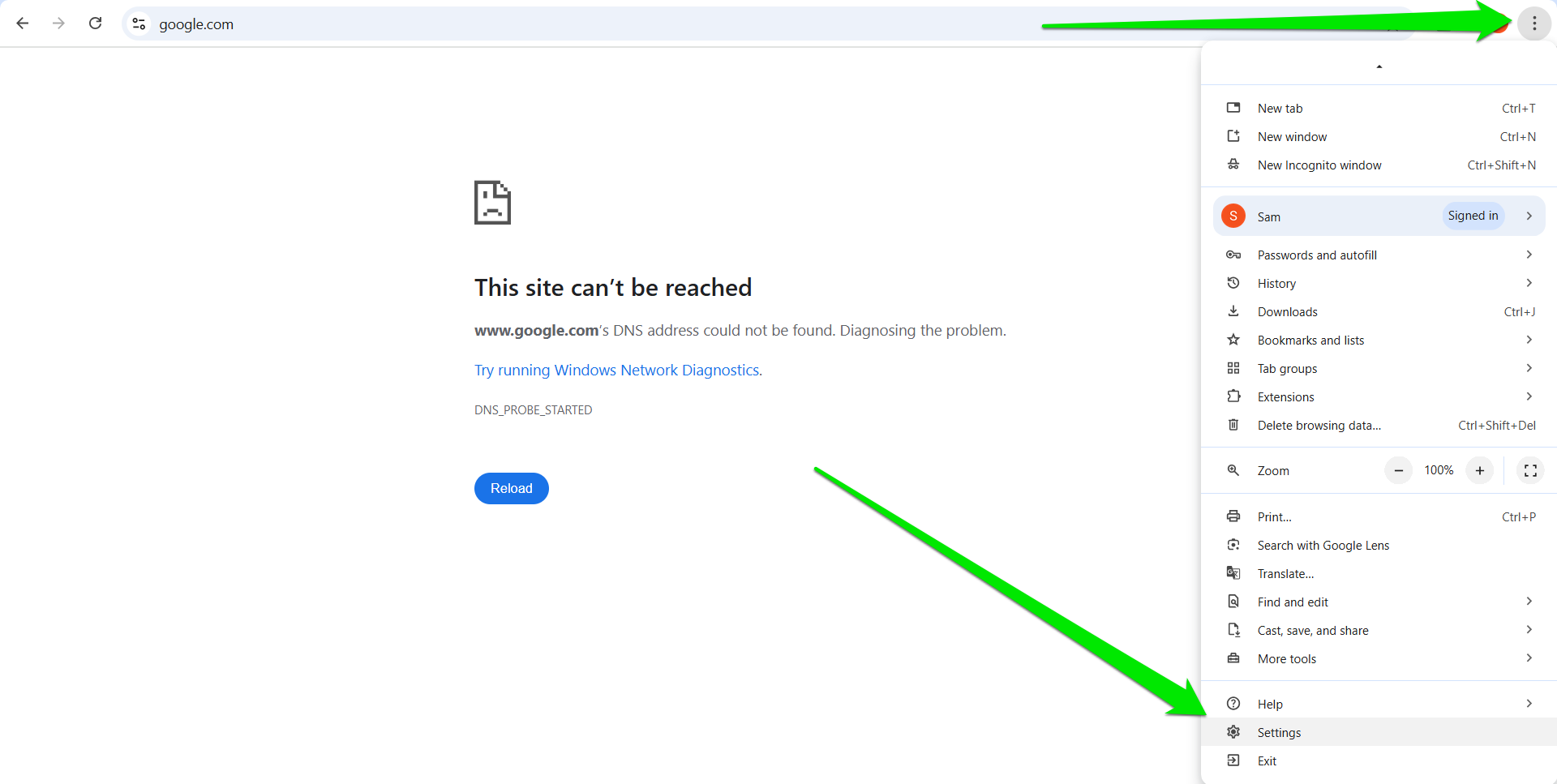 Chrome might say something like “[website’s] DNS address could not be found,” which means it couldn’t translate the domain into an IP address.