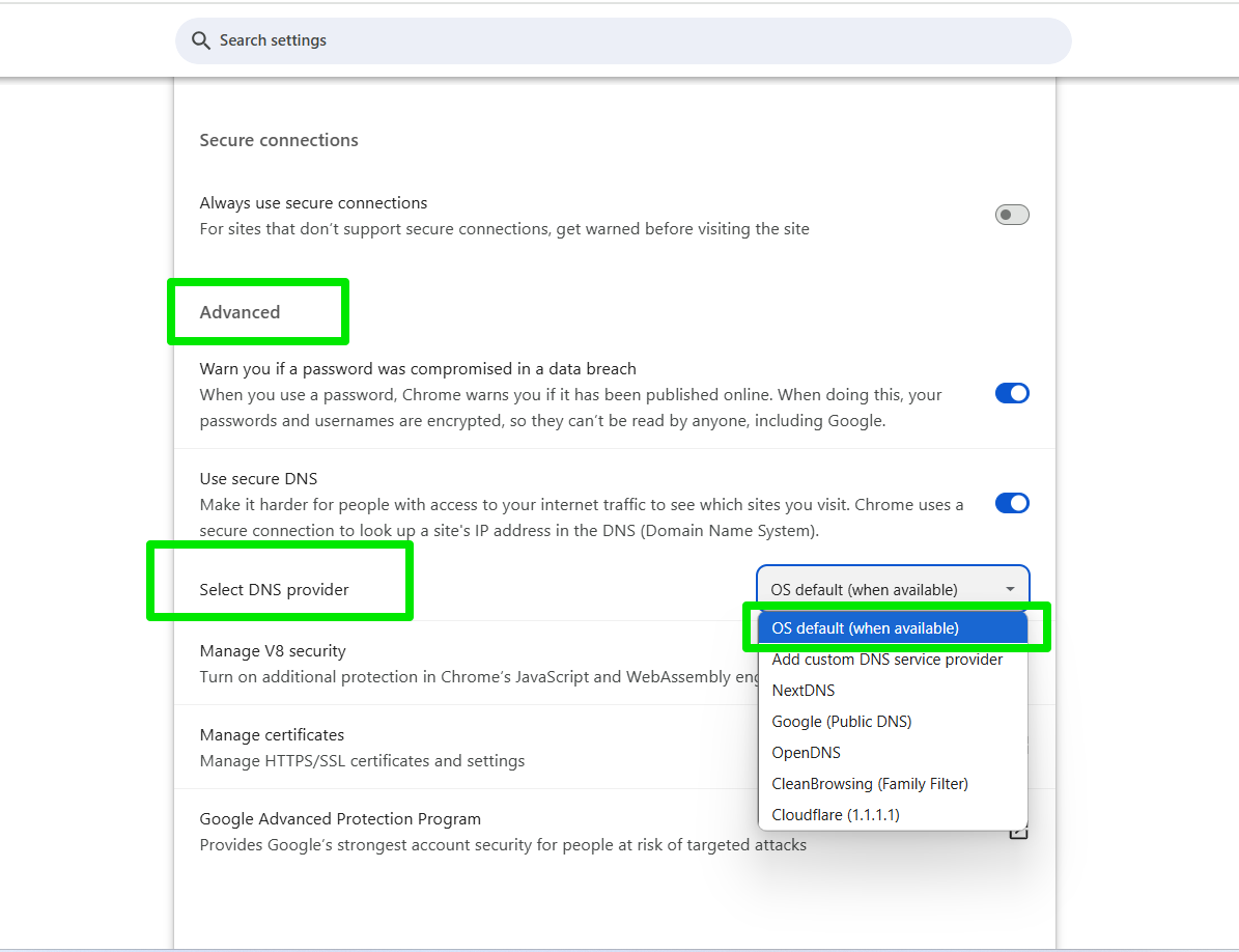 - Fix 2: Ensure your browser is set to use your system’s DNS settings