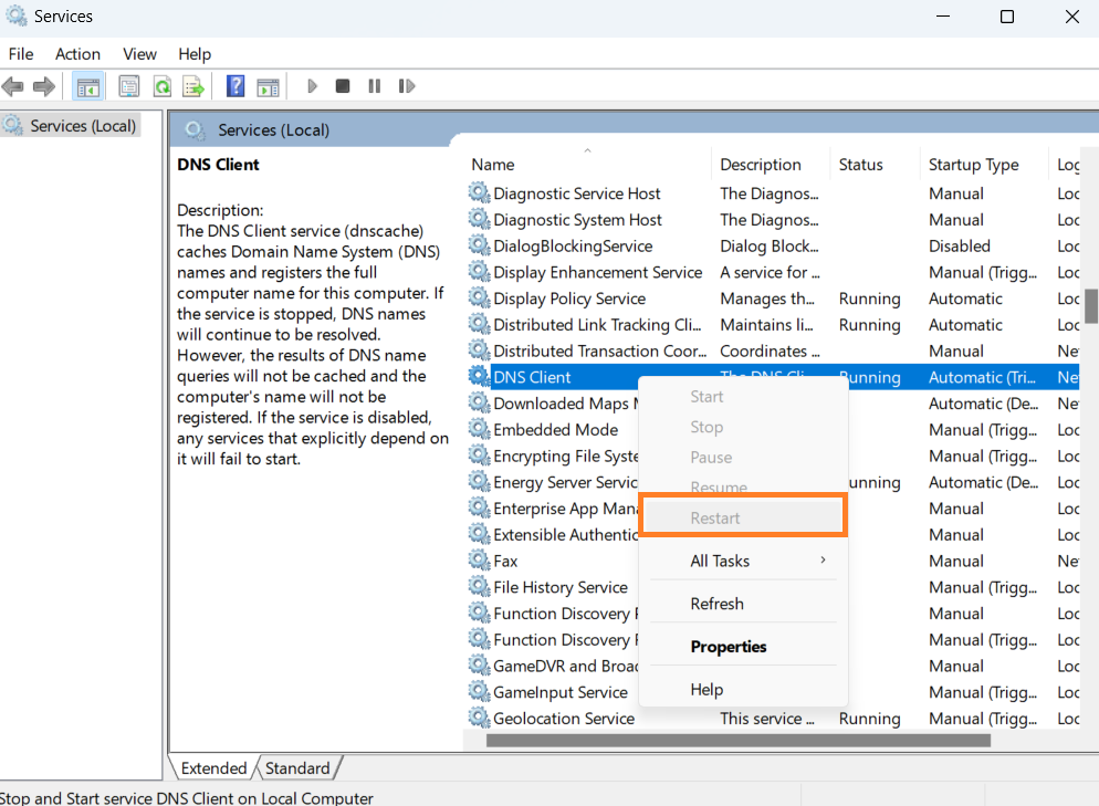 - Scroll down to DNS Client, right-click it, and select Restart.