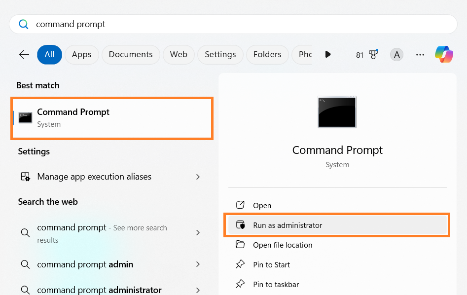 Windows + S, search for Command Prompt, and select Run as administrator.