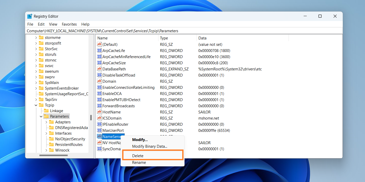 - Delete NameServer by right-clicking the entry and selecting Delete to force Windows to stop using manually specified DNS servers.