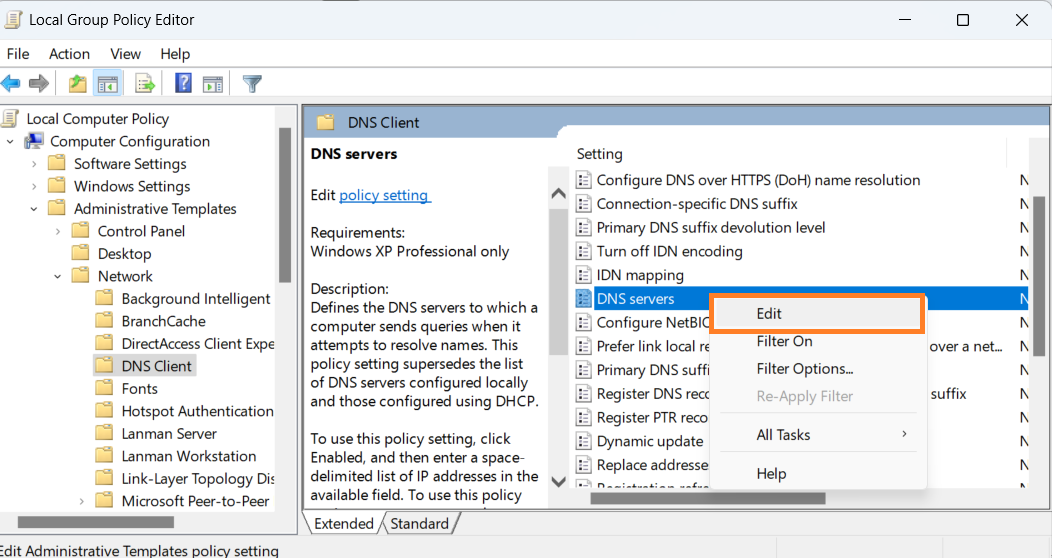 - Search for all DNS-related settings, like DNS servers or DNS suffix search list, right-click each, and select Edit.