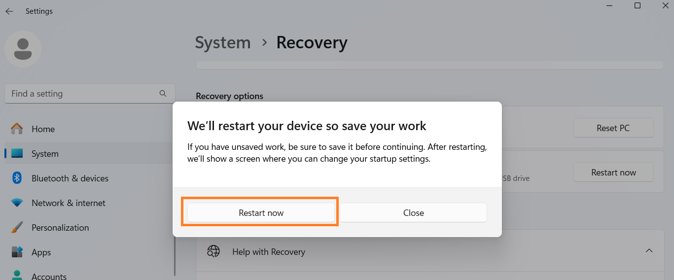 - A prompt will display telling you to save your work before continuing. After that, click Restart now.