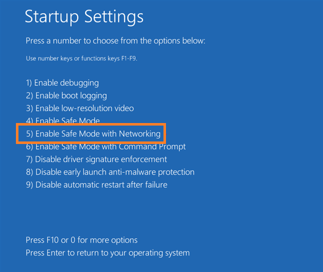 - When Windows restarts, different boot options will display. Choose Enable Safe Mode with Networking or just press