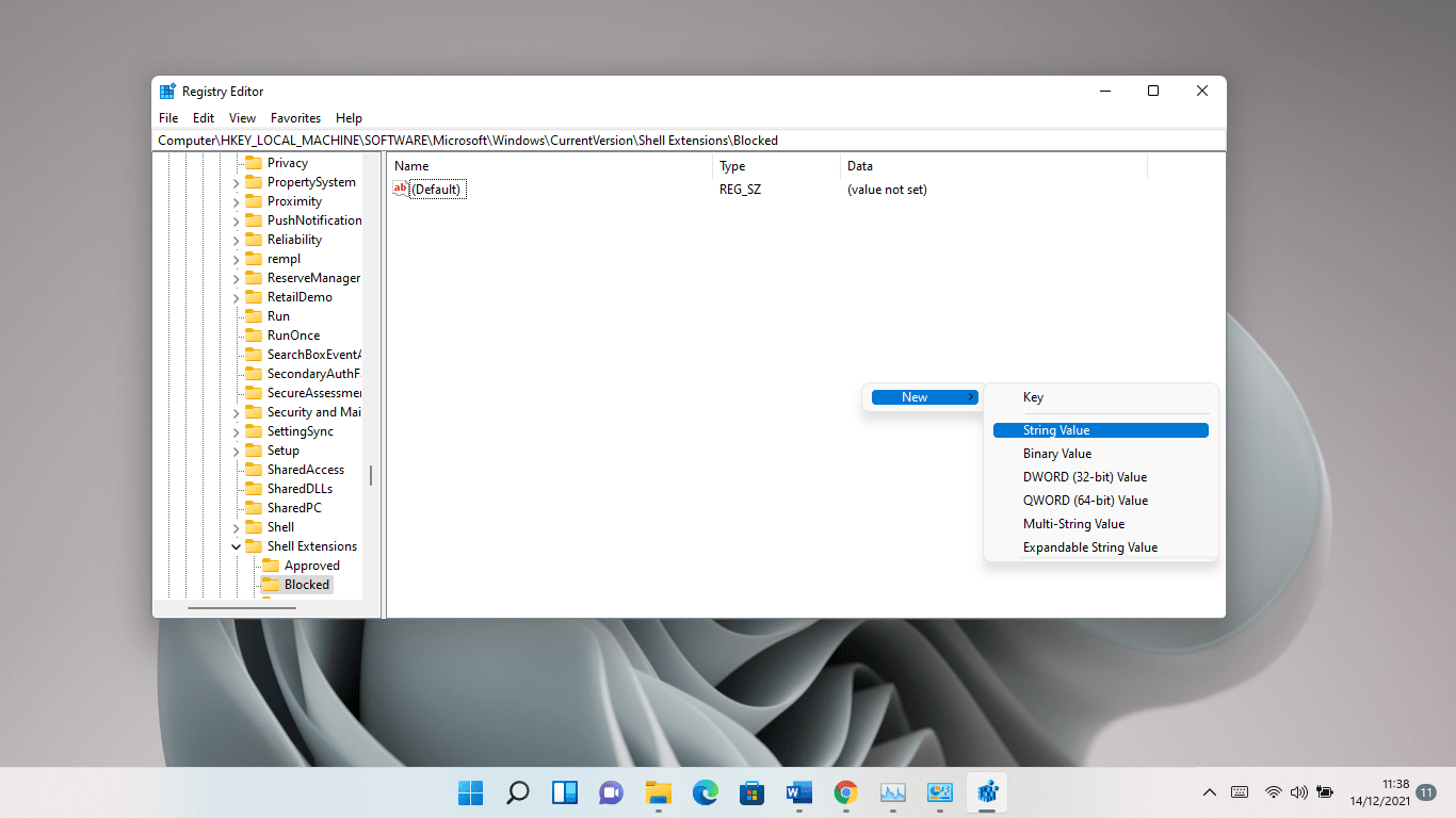 - Go to the right side of the window (where you’ll find the Default string value), right-click on the empty area, and select New >> String Value.