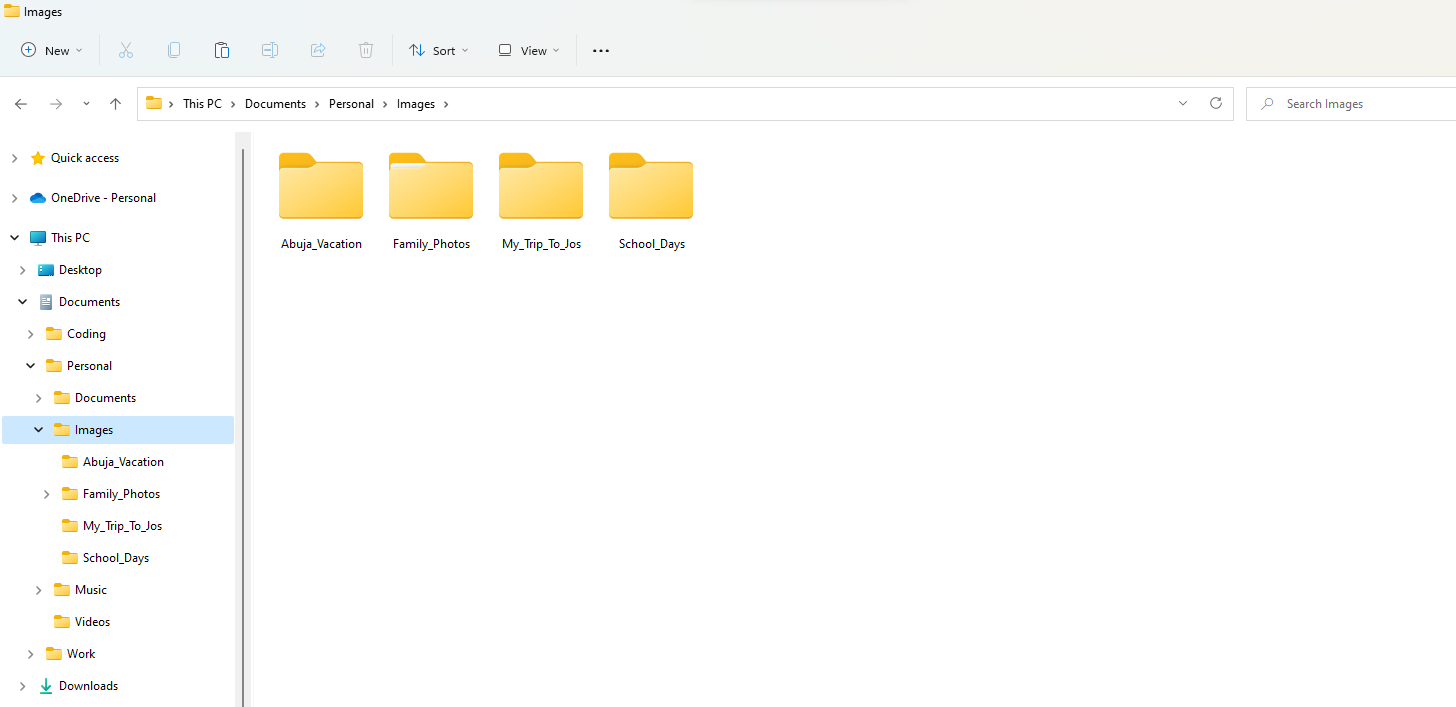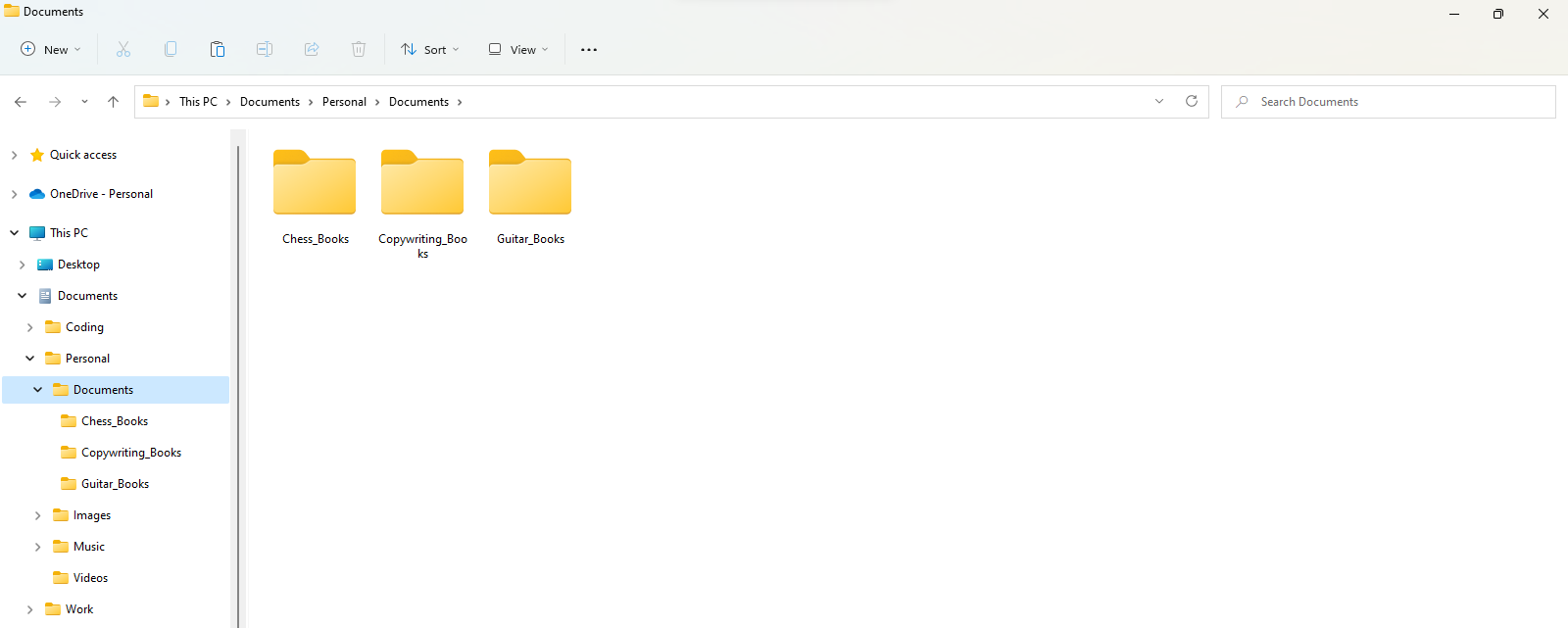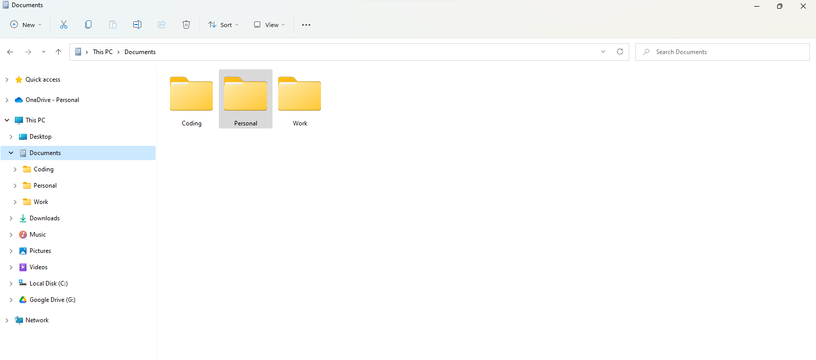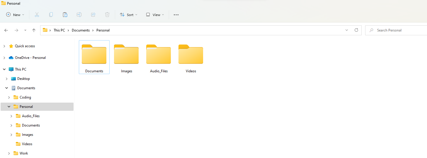 Now take a look at my Personal folder. Within it, I have separated storage spaces for images, videos, documents, and audio files: