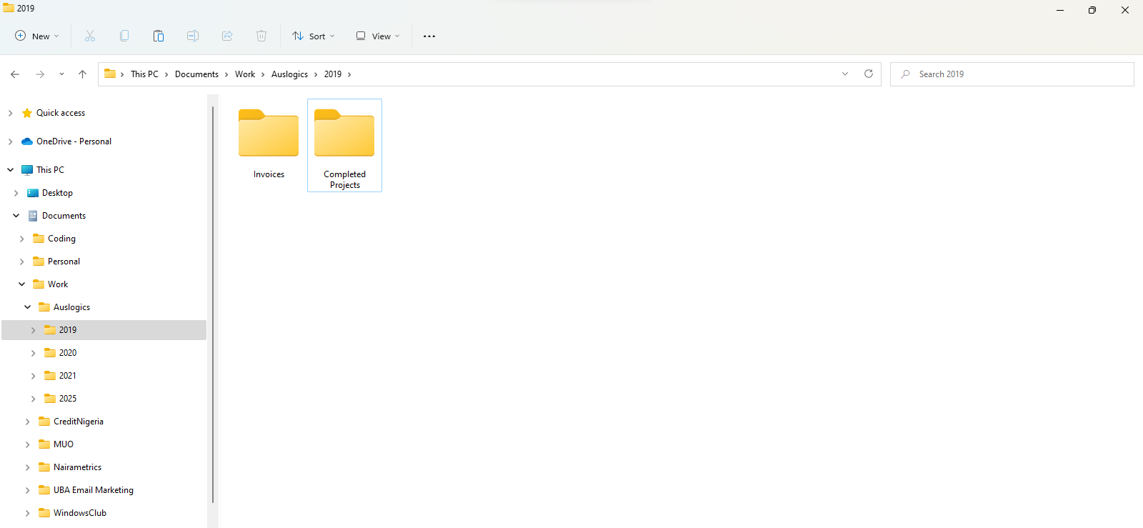 And within each year, I have subfolders for Invoices and Completed Projects in which individual files are now stored: