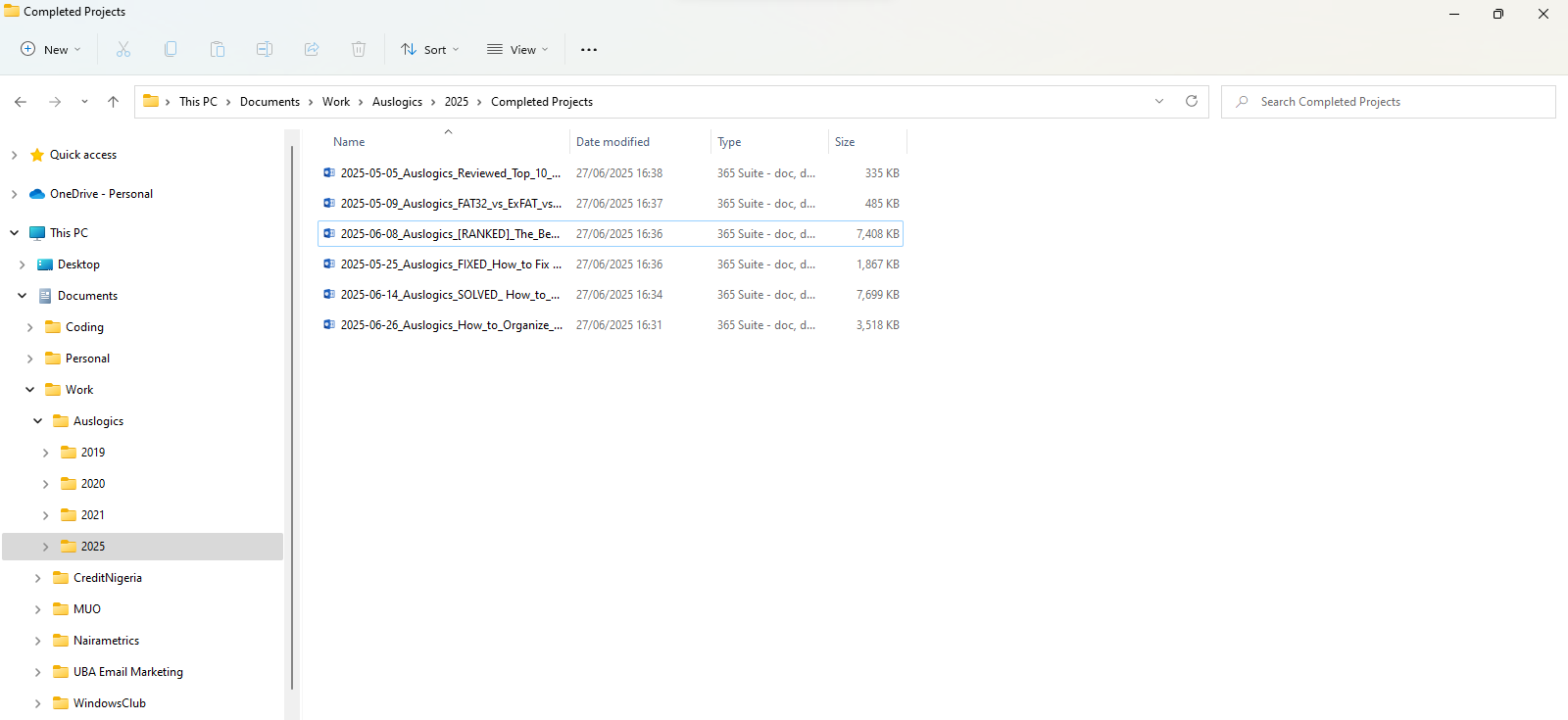 🧩 Pick a format and stick to it: Whether you use underscores, hyphens, or PascalCase (like MyProjectFile.docx), consistency is key. It wouldn’t be a good idea to name files one way today and another way tomorrow. Use the same format always.