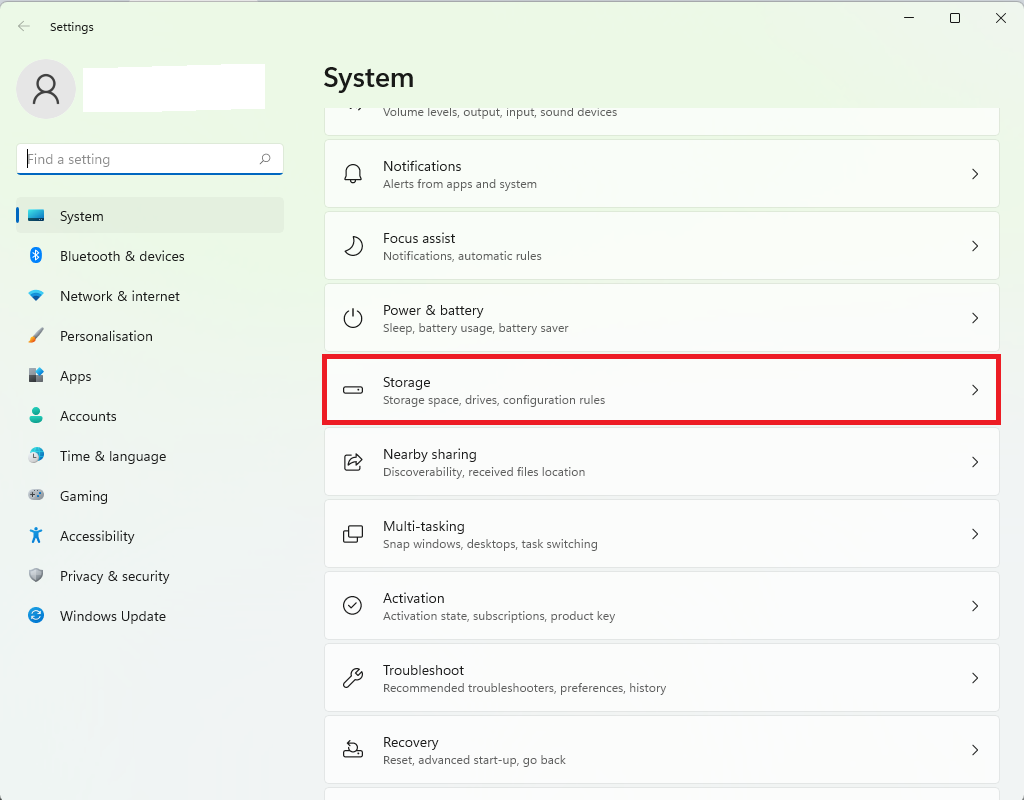 Windows + Ihotkey to open the Settings app. Then, select System in the left pane and click on Storage from the options on the right-hand side of the window.