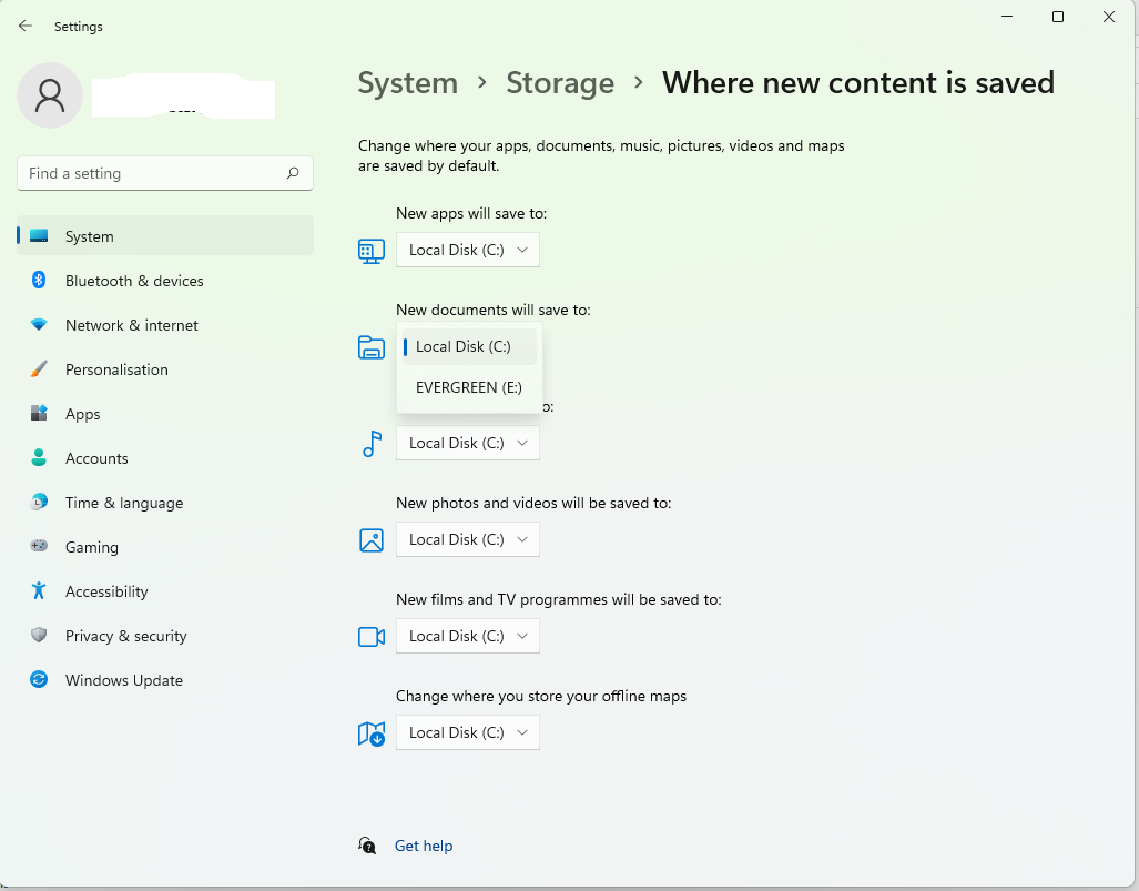 On Windows, new files are saved on the system drive by default. However, you can change the default save location to be anywhere other than your Local Disk (C:). It could be on a connected external drive, a separate partition on your internal drive, or to your secondary internal drive. To apply this setting: