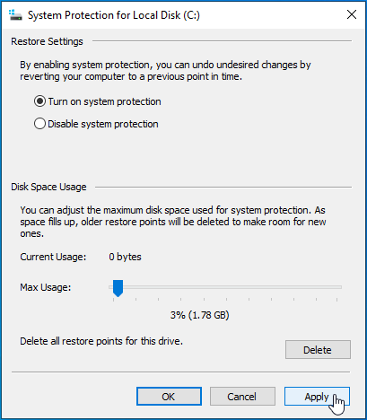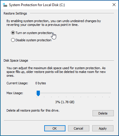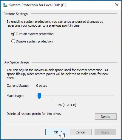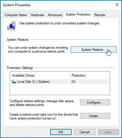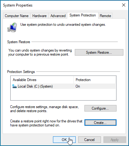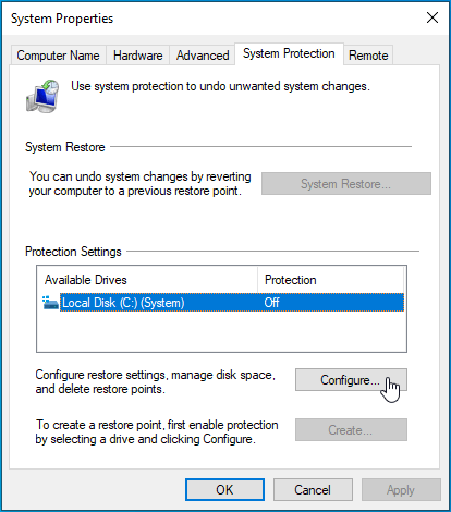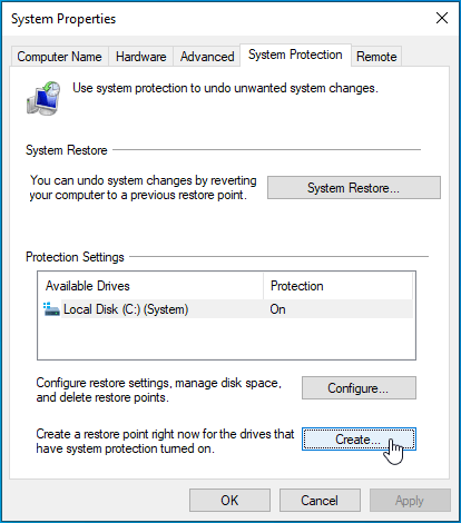 For System Restore, you need to first enable it on your device before creating a restore point. Here is how to do it: