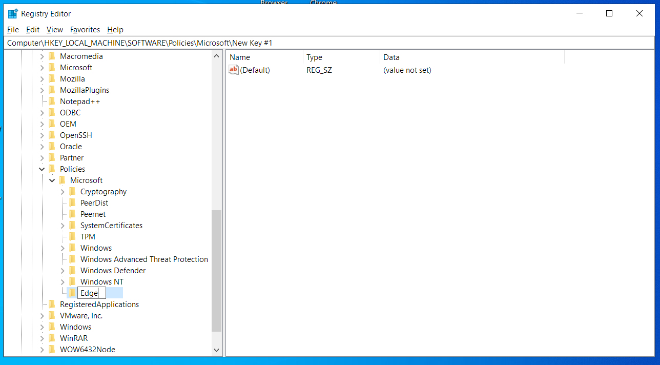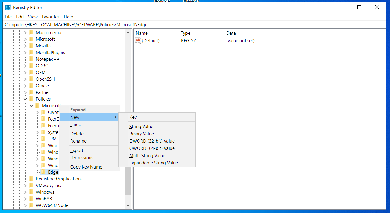 - Right-click on Edge and select New. Then click on New DWORD (32-bit) Value.
